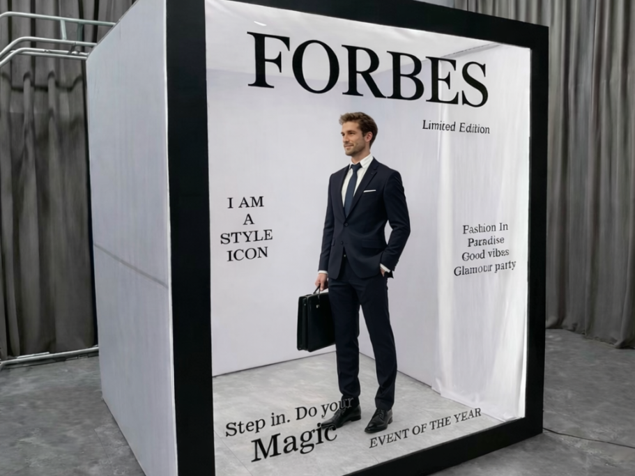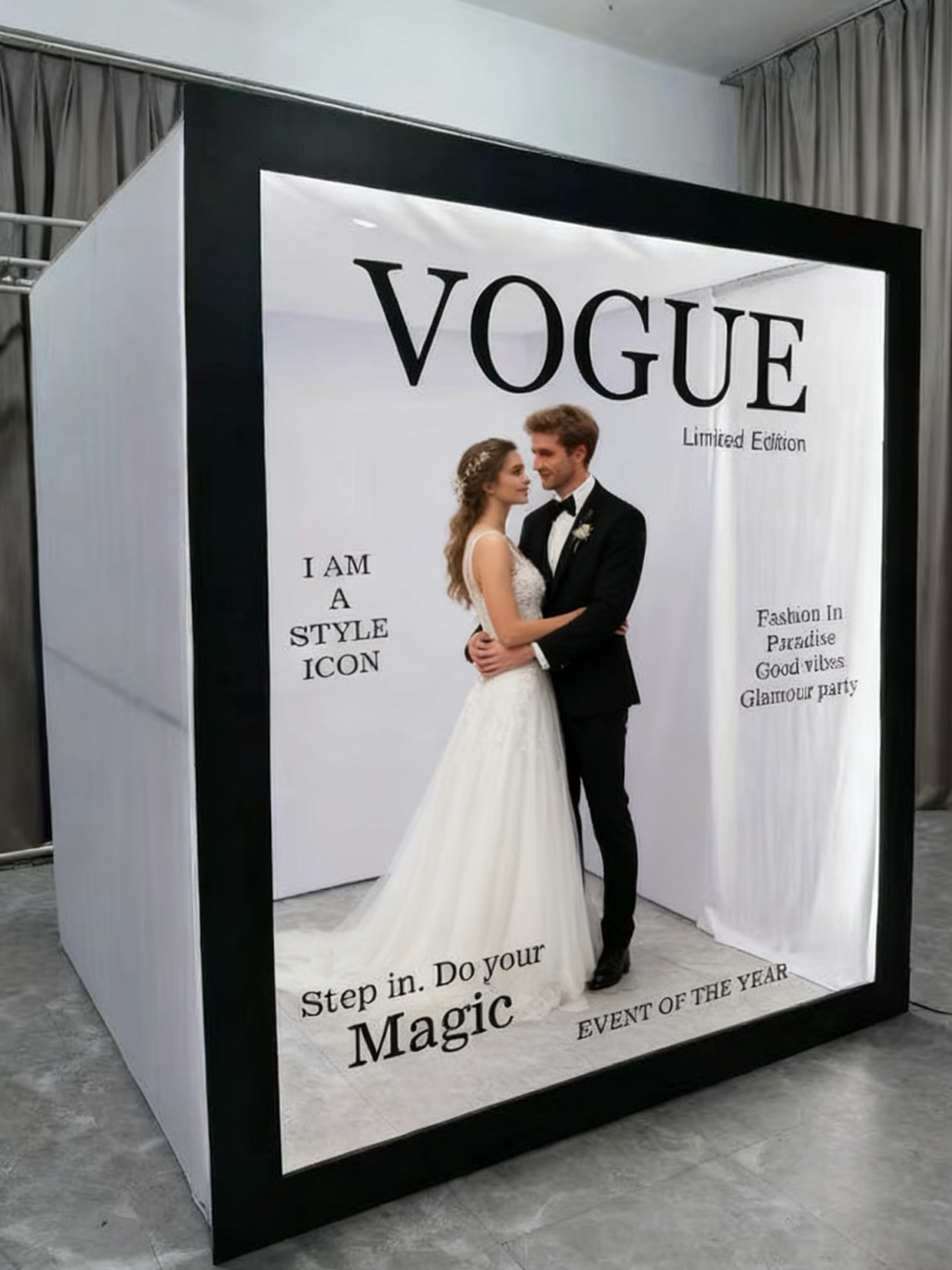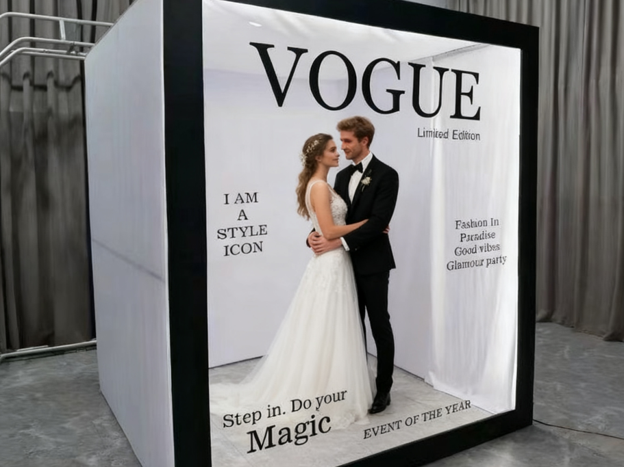 La Magazine Box reprend le concept des autres Prismatik Box mais va plus loin : chaque décor est personnalisé pour votre événement, comme une véritable couverture de magazine à votre image.